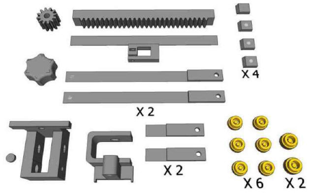 L'ensemble des pièces sera imprimé en 3D avec un taux de remplissage à 50% sauf le pignon à 100%.
