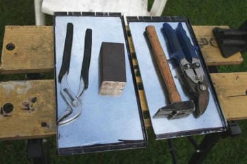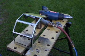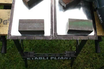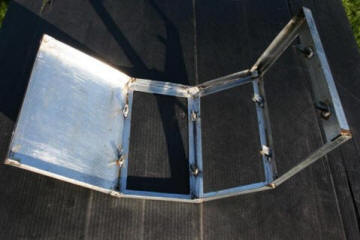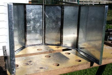 Les carter ont été réalisés en tôle galvanisée de 1mm d'épaisseur, achetée au magasin de bricolage du coin. J'ai utilisé principalement une plieuse DIY, une disqueuse, un décapeur thermique de forte puissance (ou un pistolet de soudure 100W), pour souder le carter une fois formé, et les pattes de maintien des lucarnes en plexiglass (ép. 3mm mini). Ces pattes sont des bandes de zinc de 0,5 à 1mm d'épaisseur qui seront soudés à l'étain.