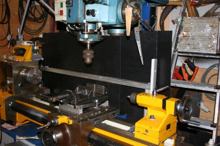 Le châssis supportant les carters a été réalisé avec du tube alu carré de 30 X 30. Le concept permet d'y mettre si nécessaire un carter à suivre pour le tournage. Cette option est intéressante pour l'usinage de pièces longues. On distingue, au bout du rail principal, une potence qui accueillera le support articulé du carter de fraisage permettant de dégager totalement la zone de travail. A gauche, au-dessus du mandrin de tournage, on peut voir le dispositif de sécurité de clé de mandrin.