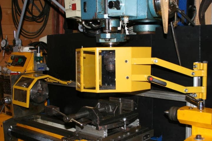 L'usinage sur machine demande une attention particulière, on ne rigole pas avec la sécurité. Si le port de lunettes est obligatoire, l'ajout de carters de protection est fortement conseillé. Non seulement pour se protéger d'un éclatement d'outil, mais aussi, pour contenir la projection de copeaux pendant l'usinage, pour maintenir la propreté de l'atelier. Sans carters, le coup de balai est permanent pour ne pas marcher sur les copeaux. Également, les vêtements remplis de copeaux que l'on retrouve dans l'habitation. J'ai donc réaliser deux carters articulés, un pour le tournage et un pour le fraisage.