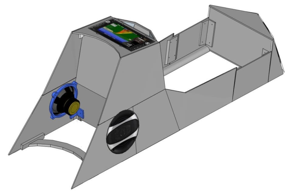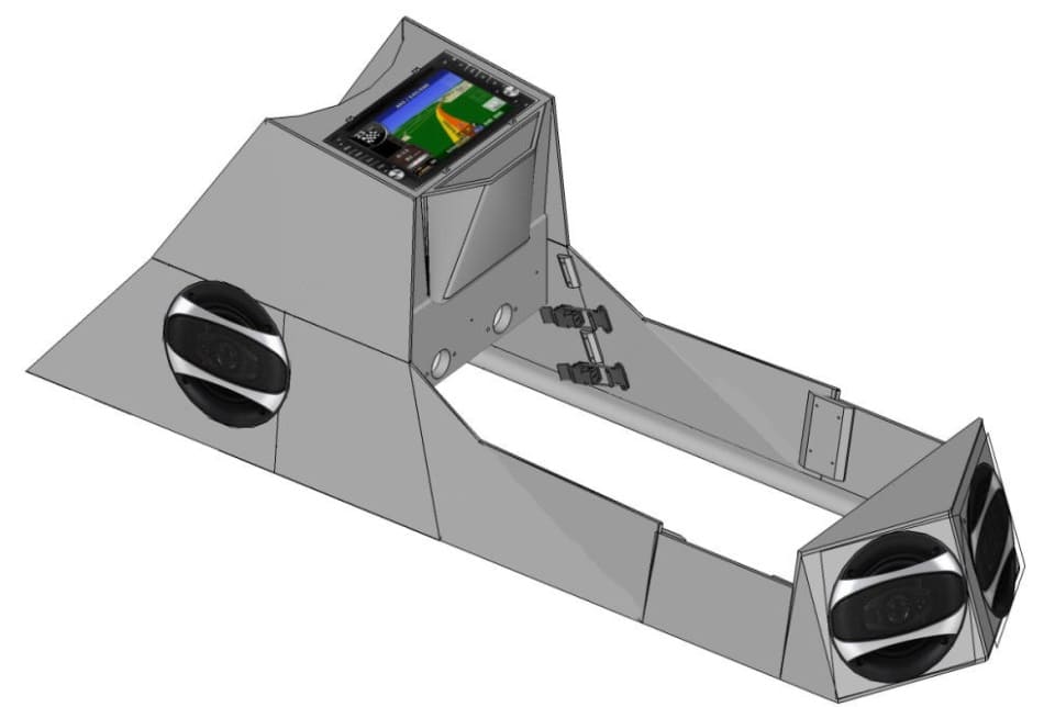 La console supporte un autoradio double din et un ensemble de 4 haut-parleurs avec un câblage invisible. Il occupe tout l'espace disponible entre les sièges.