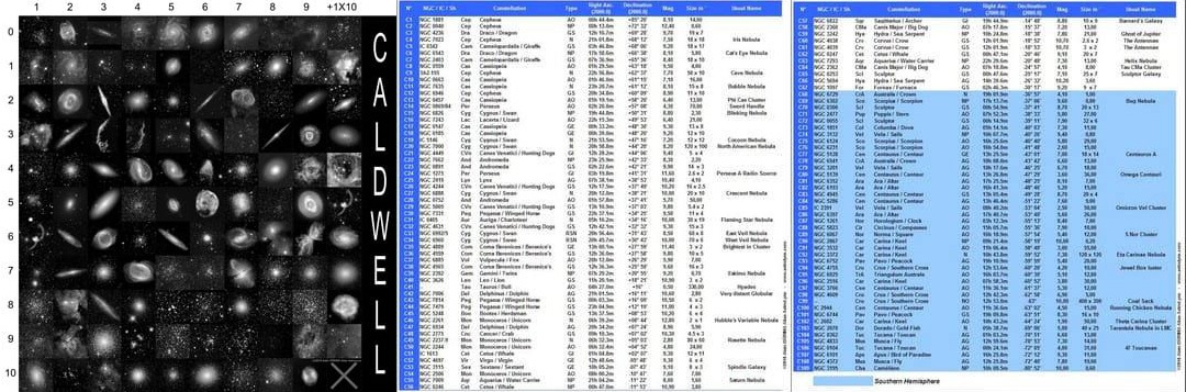The CALDWELL and MESSIER object tables give the NGC/IC/Sh correspondence, the constellation abbreviated, the name of the constellation, the type of object, the Right Ascension, the Declination, the magnitude, the size and the usual name known.