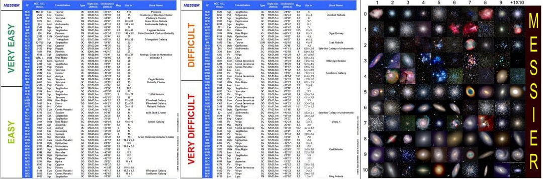 MESSIER objects in color - Tables of objects classified by difficulty.