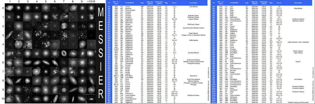MESSIER objects in black and white - Tables of objects classified by numbers.