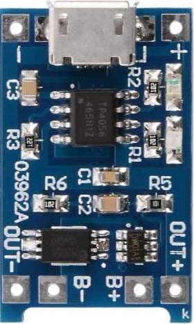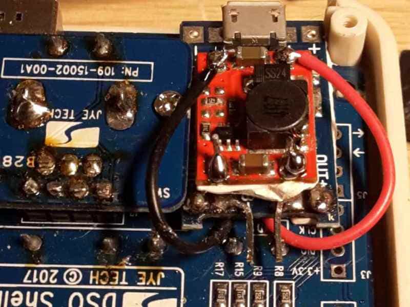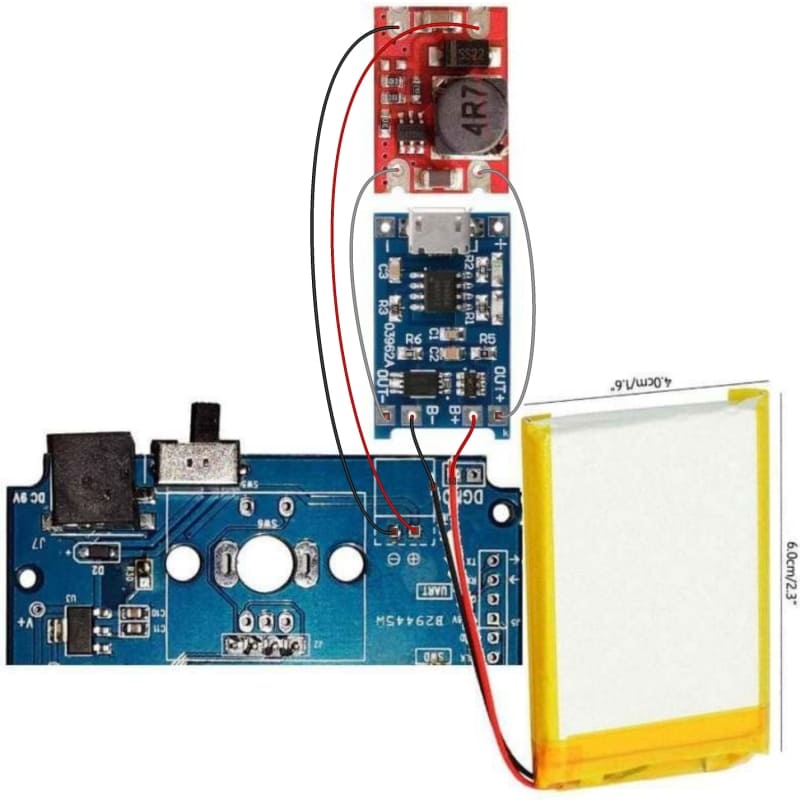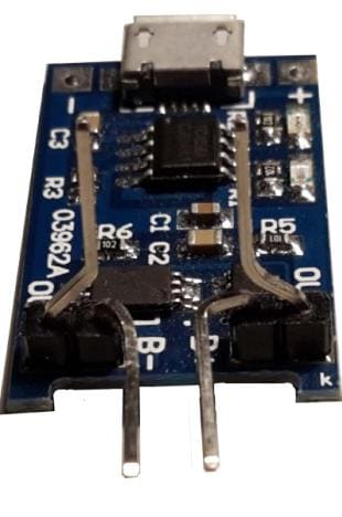 L'oscilloscope a besoin d'une tension de 9V pour un fonctionnement normal. Une batterie lithium ne fournissant que 3,7V (4,2V en pleine charge), il est nécessaire d'utiliser un booster step up 9V. Il faut bien entendu pouvoir recharger la batterie. La fonction charge et sécurité batterie est assurée par un circuit qui a fait largement ses preuves, le TP4056, la première des 3 photos suivantes. Sur la seconde photo, le même circuit sur lequel ont été soudées 4 broches (série longue). Ensuite, Il faut souder le circuit DC DC Boost Step UP (la troisième photo) en respectant le sens. La batterie sera connectée sur les 2 broches centrales en respectant la polarité lorsque l'ensemble sera opérationnel.