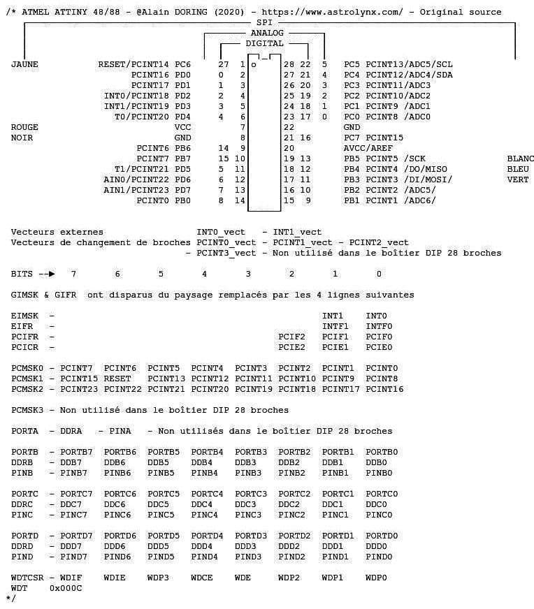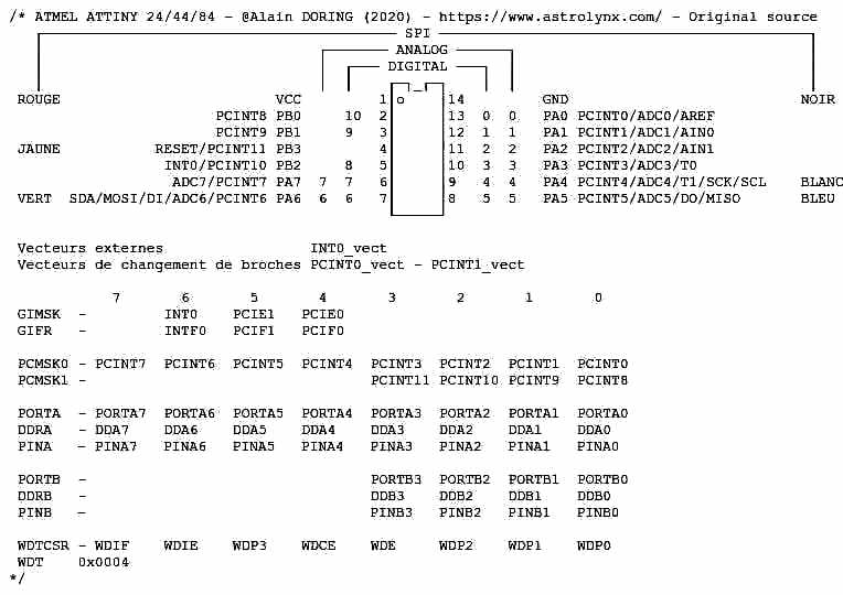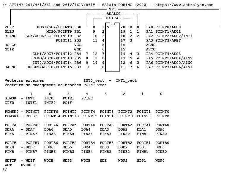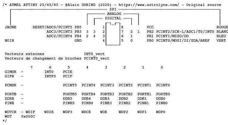 Pour utiliser ce référentiel, au début de chacun de mes codes, je fais un copier-coller de l'entête correspondant à la puce utilisée, suivi du schéma. Cela permet d'identifier à quelle puce s'adresse le code et de ne pas faire d'erreur de codage, de câblage et de branchement SPI. Vous trouverez les entêtes correspondants aux puces ATTINY84 - ATTINY85 - ATTINY861 - ATTINY88 ci-dessous