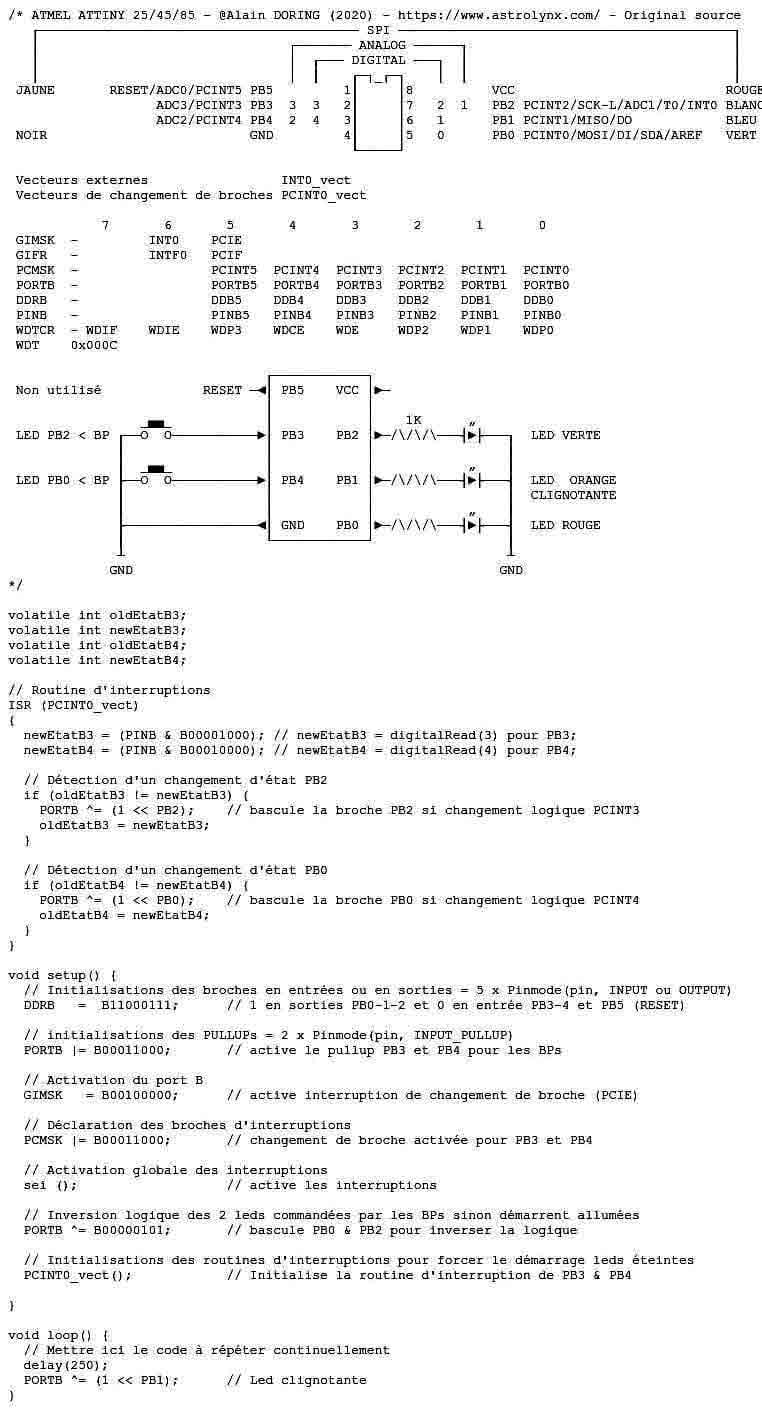 // Inversion logique des 2 leds commandées par les BPs sinon démarrent allumées // PORTB ^= B00000101; // bascule PB0 & PB2 pour inverser la logique