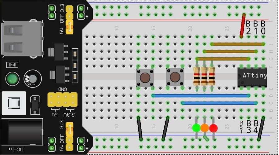 Cette vue permet de voir l'implantation des composants sur une breadboard. Les annotations B0..B4 sont à lire PB0..4. La broche PB5, notée RST pour RESET, n'est pas utilisée.