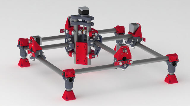 Elle peut être dimensionnée en fonction des besoins de chacun. Elle est constituée de pièces imprimées en 3D, de tubes en acier disponibles en GSB, de moteurs Pas à Pas NEMA 17, une carte de contrôle pour ces derniers, de roulements, de courroies, de visserie.