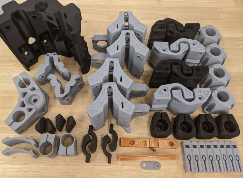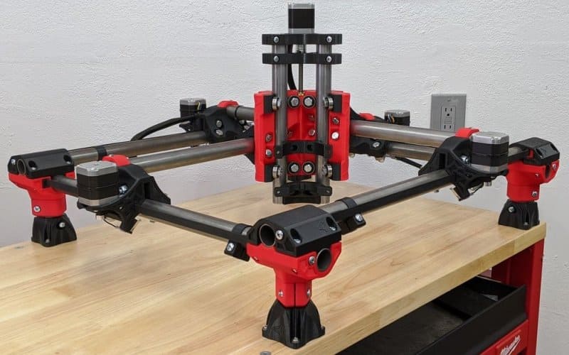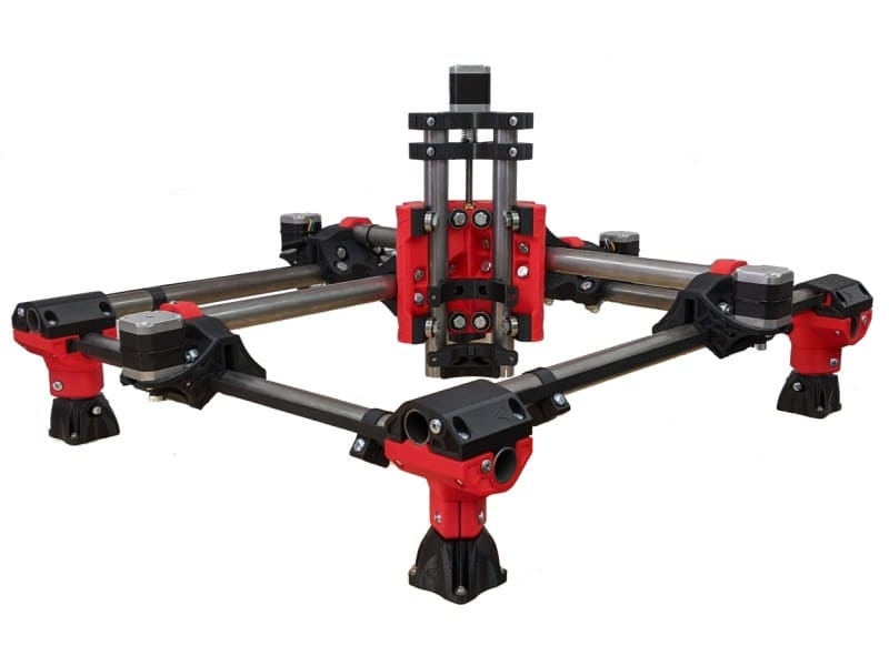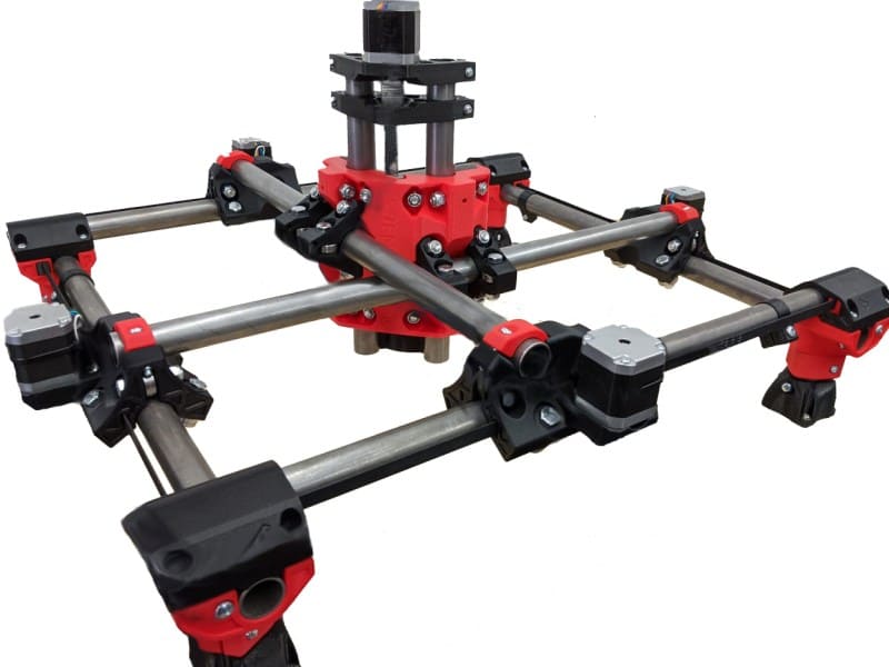 Elle peut être dimensionnée en fonction des besoins de chacun. Elle est constituée de pièces imprimées en 3D, de tubes en acier disponibles en GSB, de moteurs Pas à Pas NEMA 17, une carte de contrôle pour ces derniers, de roulements, de courroies et toute la visserie nécessaire.