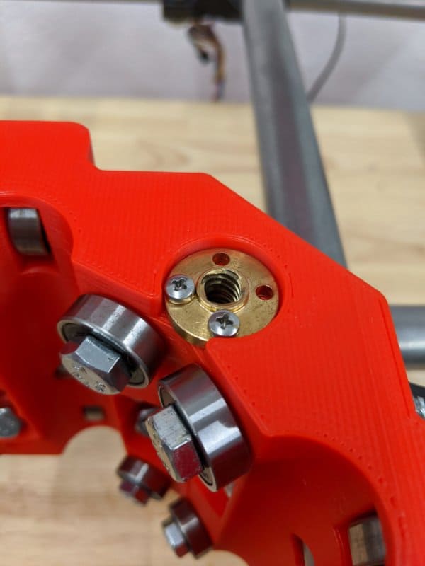 Cela doit se déplacer pour aider à l'alignement de la vis Z. Trop serré et vous pouvez avoir une contrainte. Une autre astuce consiste à les visser comme indiqué sur la photo, puis à reculer l'écrou (éloigné d'eux). Si vous constatez que vous avez un peu de reliure, essayez plutôt de déplacer les vis vers l'arrière. La gauche ou la droite peuvent également fonctionner.