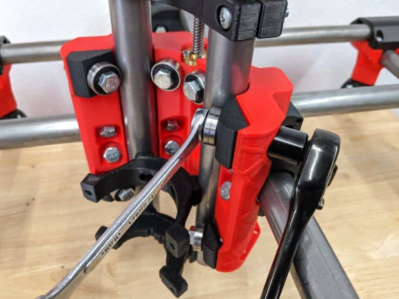 Si vous ne l'avez pas déjà fait, il est fortement recommandé de débourrer les nylstops. Bien enfoncer les écrous, utiliser une perceuse-visseuse. Les vis doivent pouvoir tourner dans les écrous nylstops sans faire un très gros effort, juste assez pour éviter le desserrage.