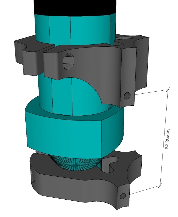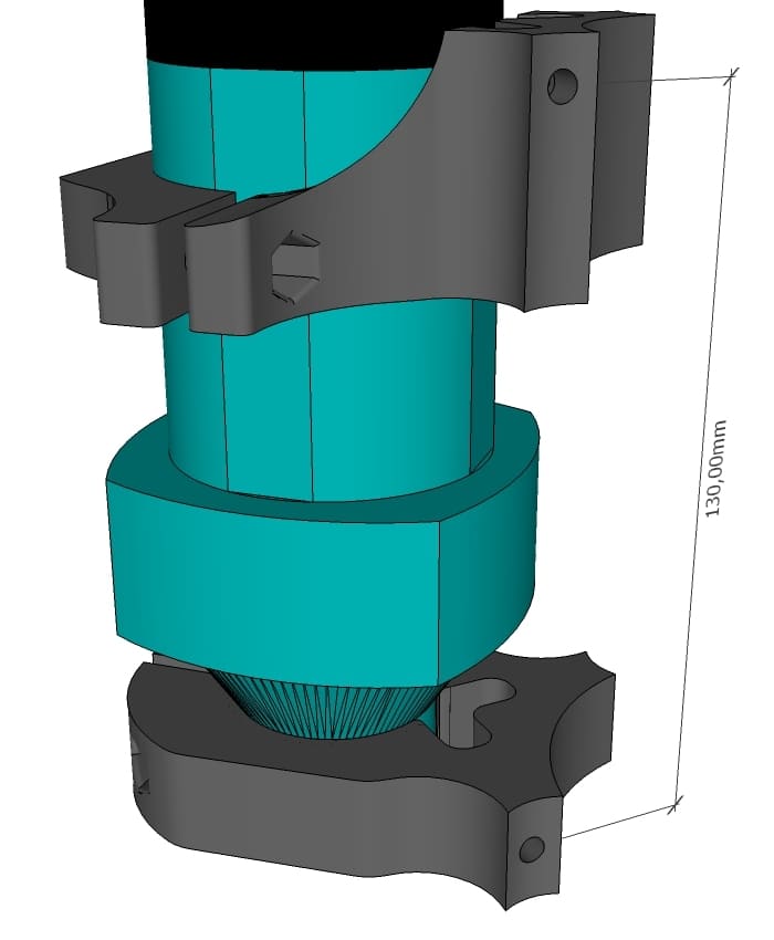 Exemple : pour les broches Parkside et OTG la côte est de 80mm et/ou 130mm en fonction du montage retenu (déport vers le bas ou vers le haut). La pièce de maintien des écrous (Nut_Trap_Primo) sera remplacé par Nut_Trap_Primo_Extended. On peut bien évidemment percer les 3 trous sur chacun des tubes Z. Voir ci-dessous.