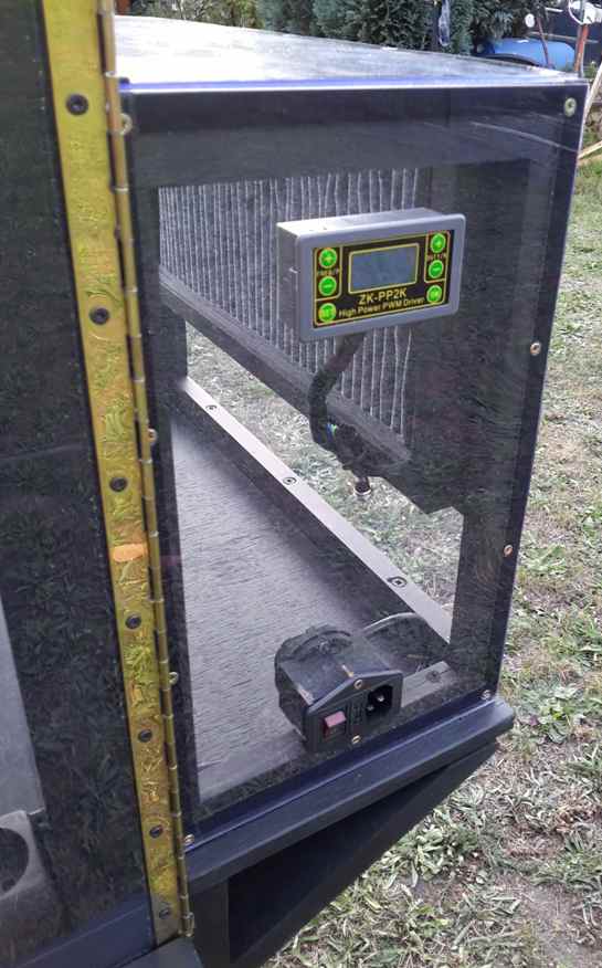Le meuble sera alimenté grâce à un câble muni d'une prise IEC mâle (genre câble d'ordinateur). Le socle recevant le câble est équipé d'un interrupteur qui gére l'imprimante, la ventilation et l'éclairage du caisson. Un cordon muni d'une multiprise placée à l'intérieur du caisson alimente l'imprimante, l'éclairage, etc... Pour plus de facilité, j'utilise un câble électrique raccourci branché sur l'alimentation de l'imprimante. Un câble avec prise de 5,5mm pour alimenter les ventilateurs est connecté au 12V du bloc d'alimentation. L'éclairage sera également connecté au 12V.