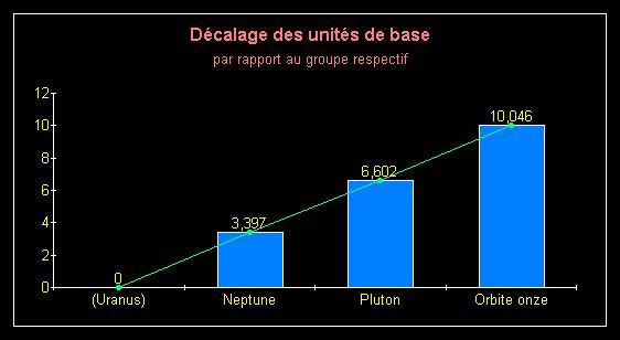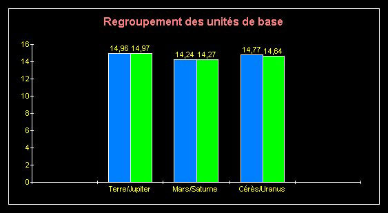 De Mercure à Uranus les valeurs de ces unités de base diffèrent très peu : de 14,244 pour Mars à 15,459 pour Vénus. Puis on constate un tassement très net pour les orbites suivantes. On remarque également un rapprochement de ces valeurs en trois groupes :