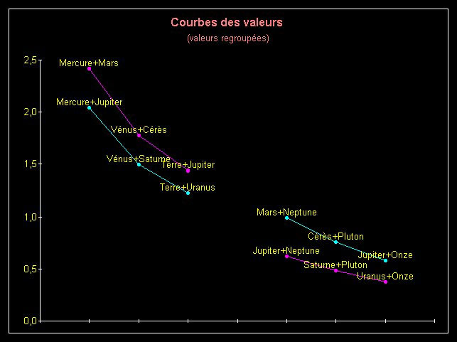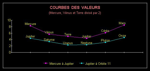 Symétriquement, il apparaît dans ce graphique que Mercure à une valeur proche de celle de Mars ; les couples Vénus–Cérès et Terre-Jupiter présentent la même caractéristique. On retrouve le même type de symétrie pour la courbe des valeurs des orbites de Jupiter à orbite onze.
