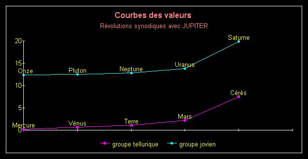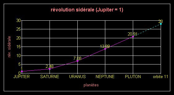 Il apparaît clairement sur ce graphique une progression régulière des révolutions sidérales des planètes Uranus, Neptune et Pluton. Plus précisément ces valeurs représentent respectivement 7, 14 et 21 fois celle de Jupiter. L’orbite suivante pourrait donc bien avoir pour valeur 28 fois celle de Jupiter.