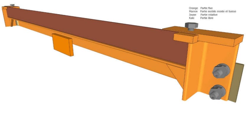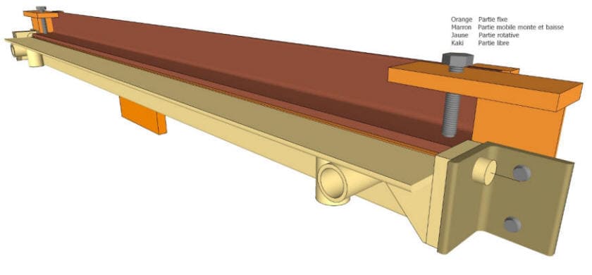 Les parties Jaune et Orange sont des ensembles de pièces mécano soudés. Les cornières principales de ces ensembles sont 1mm plus longues que la pièce Marron constituée d'une cornière de 50 X 50 d'une longueur maximum de 1 mètre qui va servir à maintenir la tôle à plier.