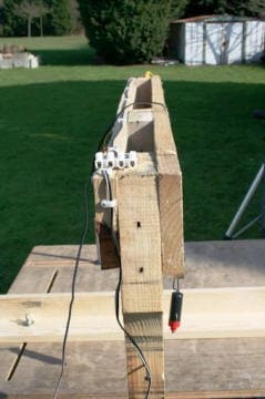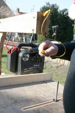 Pour jouer sur la température du fil, j'utilise un câble de mesure équipé de deux pinces crocodiles. Je fixe un côté sur la fixation supérieure du fil et je fais glisser l'autre pince croco sur le fil chauffant. Plus j'abaisse le point de contact, plus la température augmente. Simple ! NON ! Il fallait y penser. Pour alimenter le fil, j'utilise une batterie de démarrage (genre Power Tank). ATTENTION ! La Power Tank 17Ah de Celestron vaut plus de 100 €uros et c'est une 250A de décharge instantanée. La mienne m'a coûté 35 €uros chez LIDL il y a déjà quelques années et c'est une 600A !... Depuis j'utilise les batteries de ma voiture que je récupère après changement sans aucun problème particulier.
