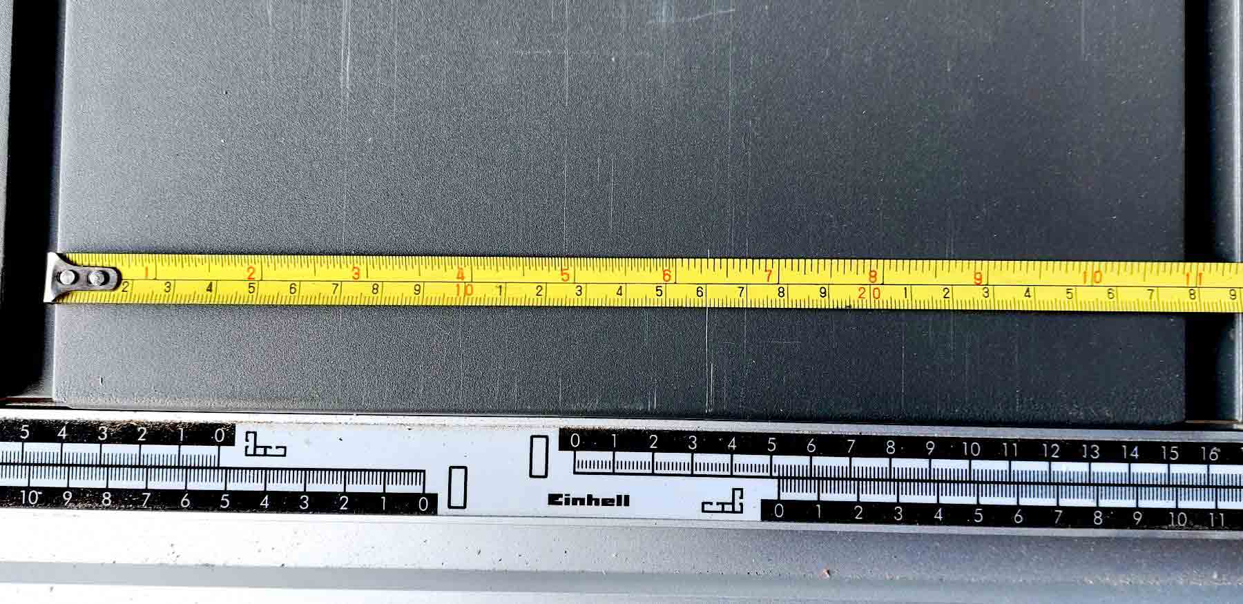 Pour commencer, vérifions le parallélisme des rainures à l'aide d'un mètre ruban. La précision n'est pas suffisante, mais elle permet de se faire une idée sur le matériel.