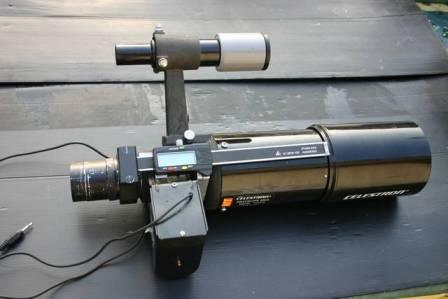 Nous sommes maintenant en possession d'une règle de mesure. Il faut l'adapter à notre instrument, chaque cas est différent. Le montage est à votre convenance. Voici un exemple monté sur une lunette Celestron 80 X 400.