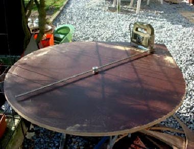 Utilisation de plaque de contreplaqué bakélisé. Découpage du plateau avec compas et scie sauteuse.
