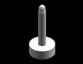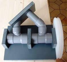 Reste à terminer la motorisation de la table. Pour cela, 2 joues en PVC de 6mm d'épaisseur serviront de support à la vis de commande de la roue et au moteur pas à pas. Ces deux éléments étant eux-mêmes reliés par poulies et courroie. Ce support pivotera autour d'un axe constitué de deux vis fixées sur la table inférieure (attention !... pas sur la platine inférieure) et se verra bloqué par deux autres vis (donc 2 de chaque côté) en position de fonctionnement. Ceci permettra, en débloquant et en désengageant la vis de commande de sa roue, de libérer la table pour procéder à son équilibrage et à son repositionnement. Ci-dessous les 2 joues à ajouter au montage... Remarquez les 2 lumières de réglages.