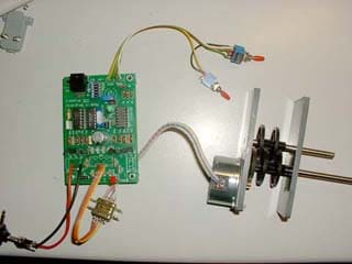 Le pilotage est assuré par une carte ECO-STEP de chez VISUAL KIT distribuée par CONRAD ou SELECTRONIC pour environ 200 Francs (30 Euros). Ce kit est livré avec un moteur pas à pas qui sera simplement remplacé par celui récupéré dans une imprimante pour faciliter le montage du réducteur avec le pignon de sortie.